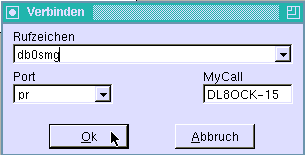 Will man eine Verbindung aufbauen, so macht man die im Menü Kanal. Dort gibt es den Punkt Verbinden. Wurde dieser aufgerufen so meldet sich ein neues Fenster, bei dem man das Zielrufzeichen eingibt. Der Port pr sowie das bereits voreingestellte MyCall erscheinen im Fenster, beide Parameter können hier noch geändert werden (bei Port nicht sinnvoll, s. o.). Nach der Eingabe des Zielrufzeichens eventuell von Digipeatern gefolgt wird die Verbindung aufgebaut und es gibt ein neues Fenster.