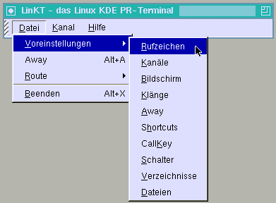 Nachdem man sich eingeloggt hat, gibt man "linkt" als Befehl ein. Es erscheint ein neues Fenster und es meldet sich "LinKT - das Linux KDE PR-Terminal". Die Menüs Datei, Kanal und Hilfe werden angezeigt.