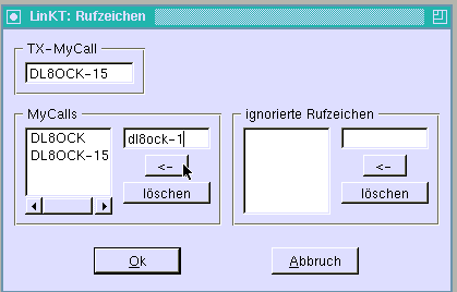 Als nächstes sollte man sofort sein MyCall, sein Rufzeichen eingeben. Dieses macht man unter Datei. Das Rufzeichen wird für jeden Benutzer einzeln abgespeichert, im Home-Verzeichnis (~/) wird ein Verzeichnis .vnc erzeugt. Unter Datei -- Voreinstellungen findet sich der Eintrag Rufzeichen. Dort trägt man in das Feld TX-MyCall das eigene Rufzeichen ein, eventuell gefolgt von einer SSID. Unter MyCalls gibt man dann noch weitere Rufzeichen ein, unter denen man erreichbar sein will. Ánschließend mit OK bestätigen.